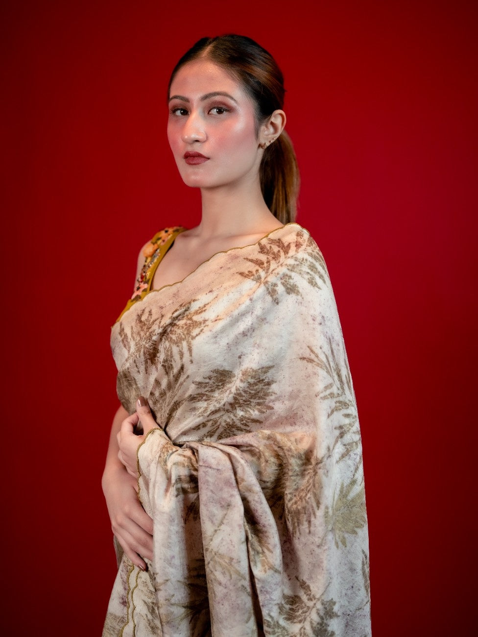 - Description: Inspired by the lush green forest in spring, the Aranya Sari is a handwoven mulberry silk saree printed with silver oak leaves and hand-dyed in pomegranate skins. It features an embroidered scallop border and intricate hand needle shibori on the pallu.