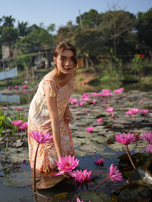 “And when she walked, gardens bloomed”. Our Gulshan silk slip dress is printed with marigold flowers on a base of romantic sappanwood pink, finished with a tie up detail. Pair it with our Dahlia trench for a perfect evening look..