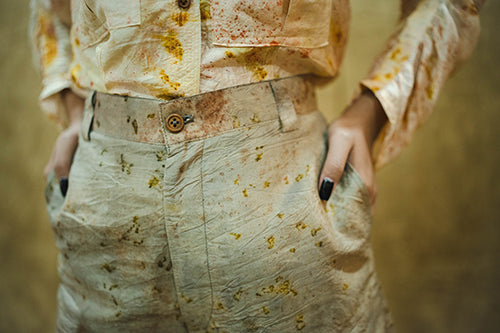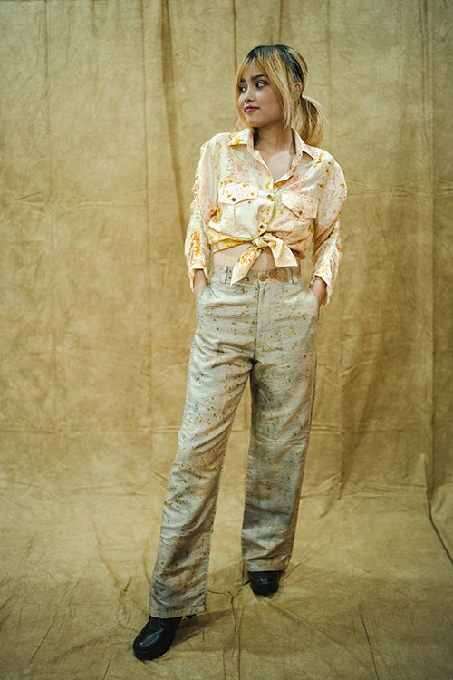 “And the sun took a step back, the leaves lulled themselves to sleep. Autumn was awakened.” Pure silk pants, printed with fallen leaves and flowers is our ode to Autumn.