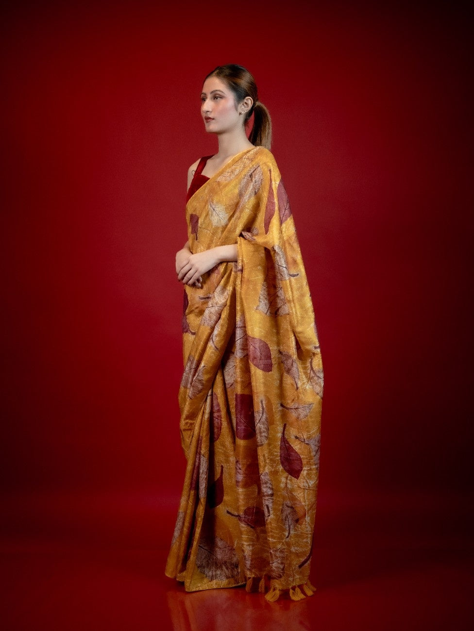 - Description: The Sunehri Sari features an exquisite golden hue crafted from temple waste marigold flowers. Printed with teak leaves on the golden base, this saree is perfect for any occasion.