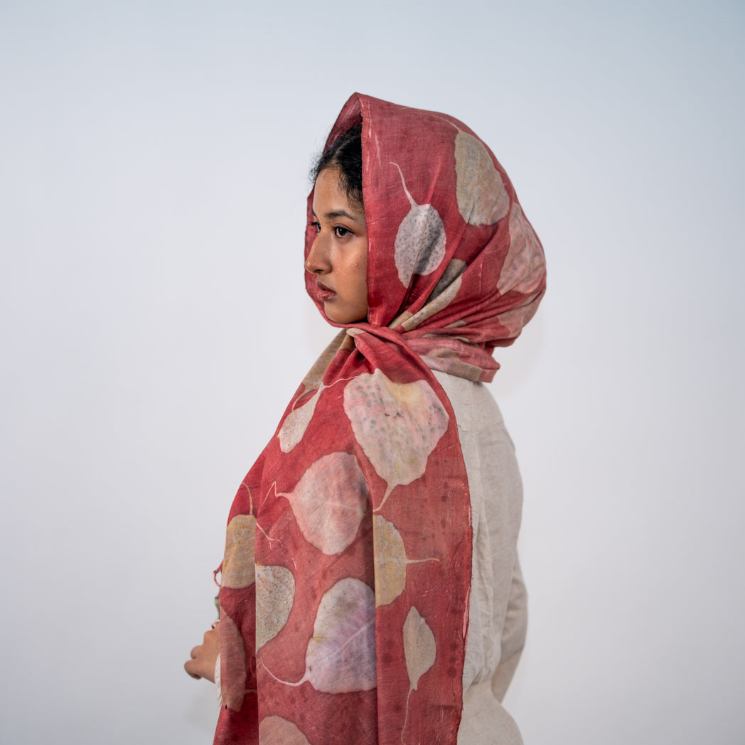 Immerse yourself in the serene elegance of this earthy stole, dyed with sappanwood and adorned with delicate peepal leaf impressions. Each piece reflects a soulful union of heritage craftsmanship and nature’s storytelling.