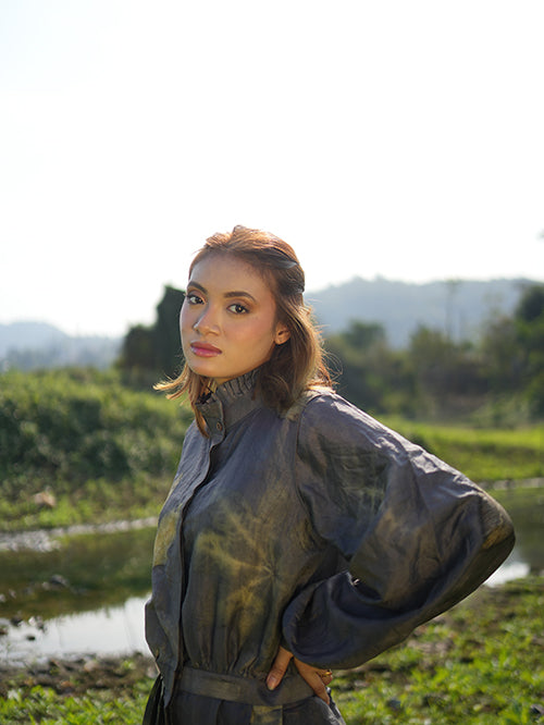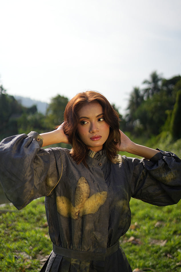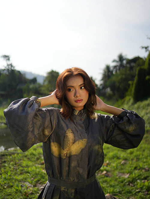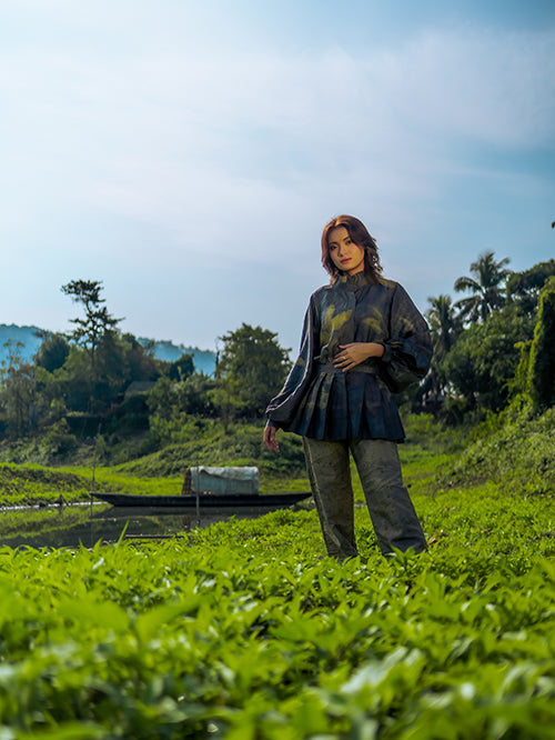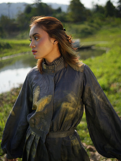 “The leaves are all falling, and they’re falling like they’re falling in love with the earth.” Bhumi means earth in Sanskrit. Our Bhumi top made in pure silk, eco printed with fallen leaves on a base of pomegranate dye, complete with beautiful pleat detail and puffed sleeves to give it an old world Victorian charm.