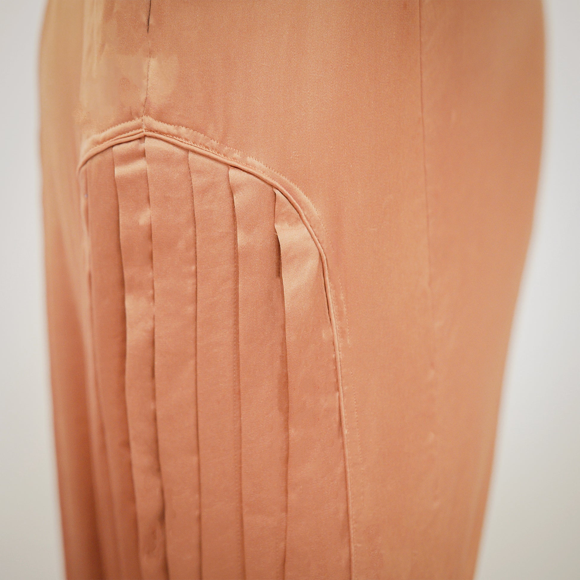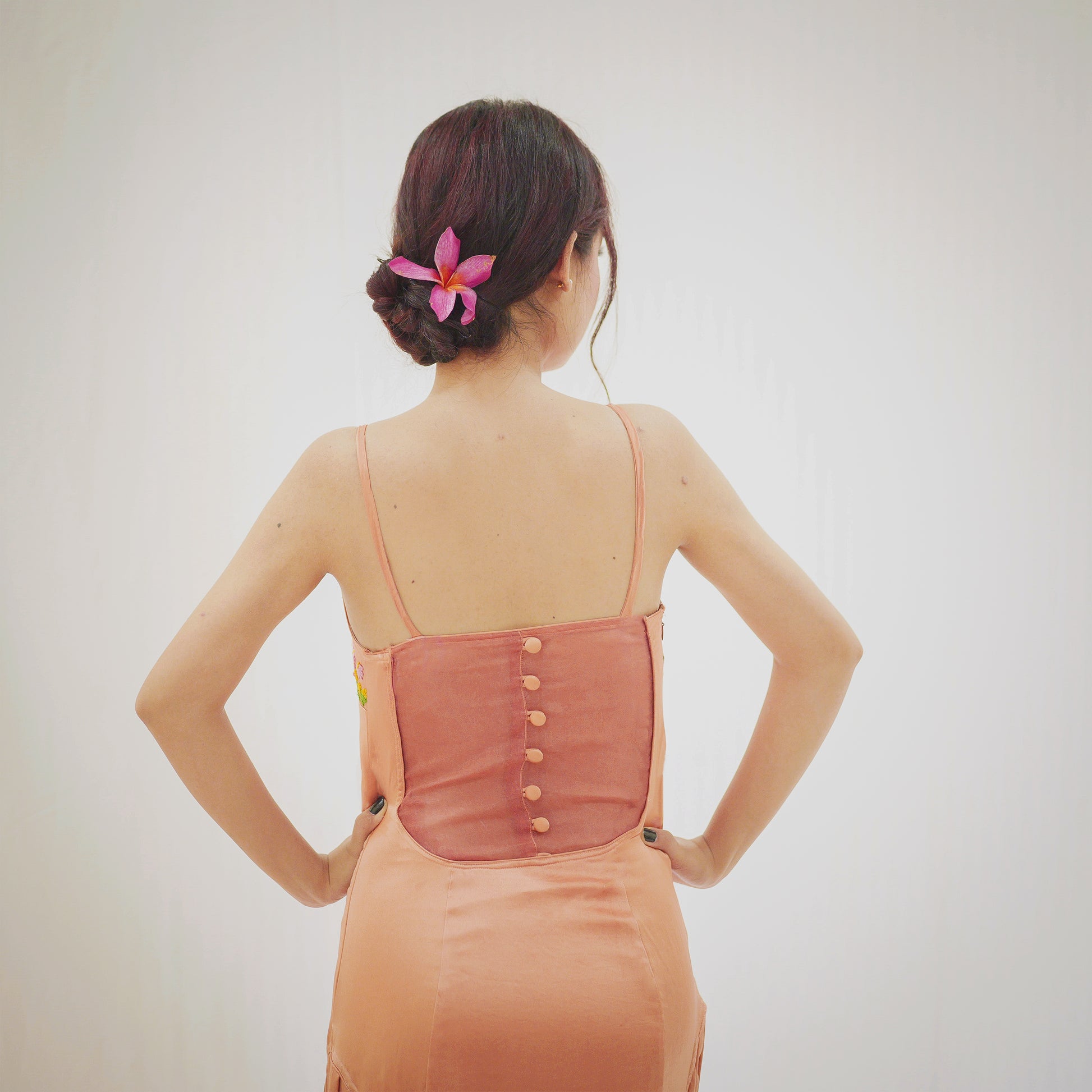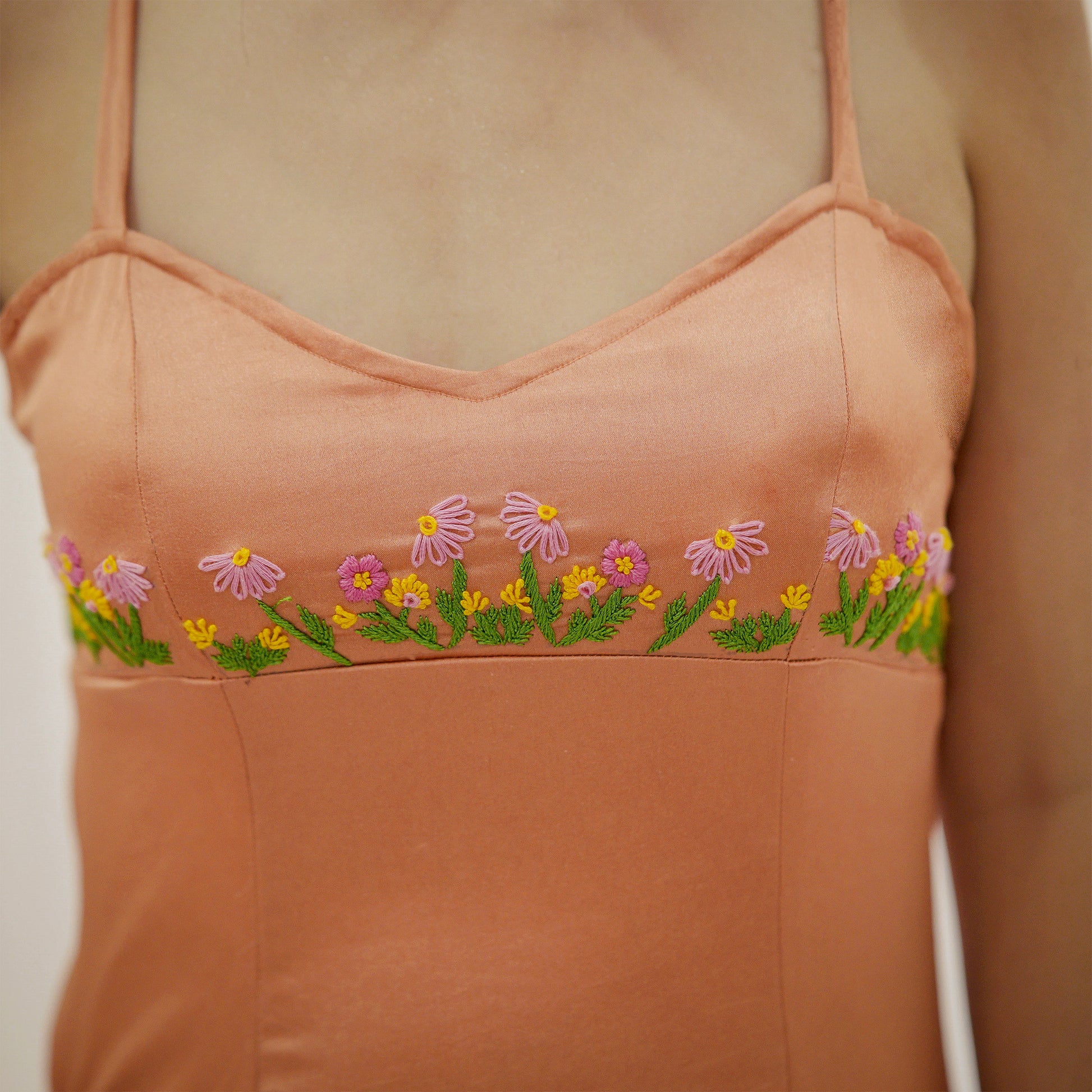 Mulberry silk dress with pleats details. The dress is beautifully hand embroidered with floral designs on the bust line. It is naturally dyed with maadder roots.