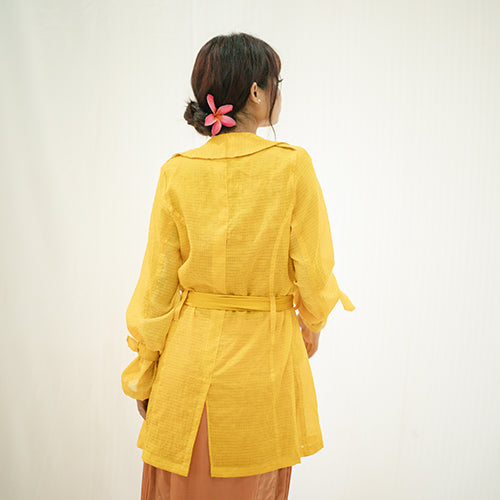 Full sleeves pure silk kota doria trench coat with beautiful floral hand embroidery at the collar. The coat is naturally dyed with turmeric.