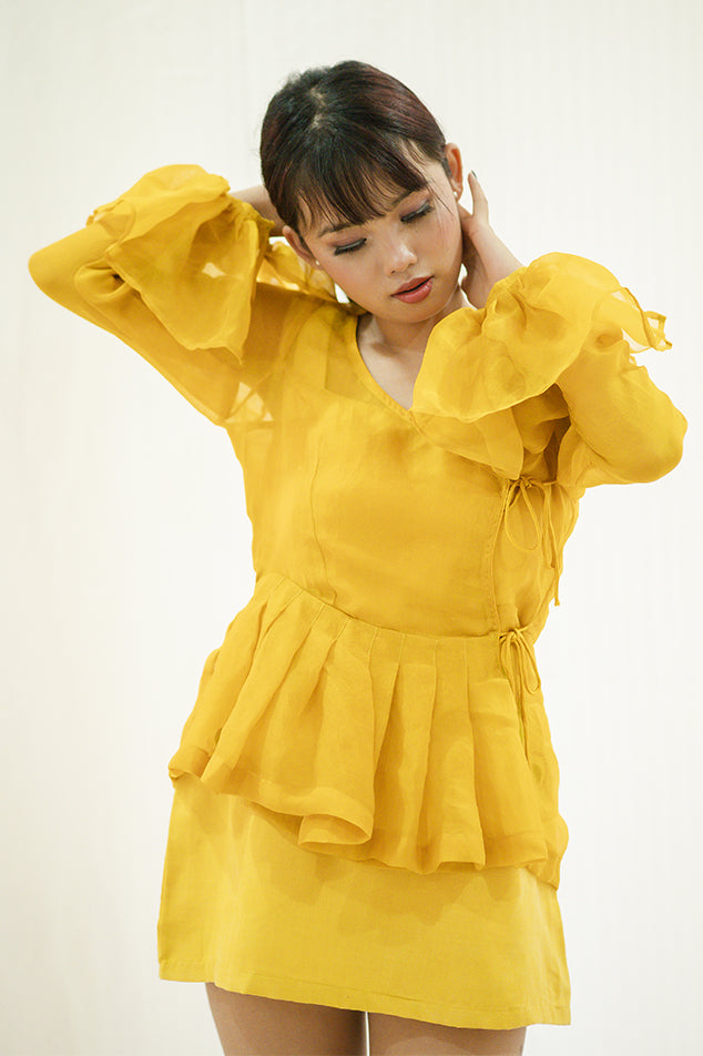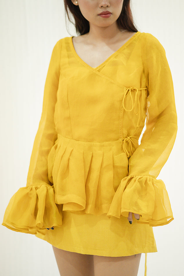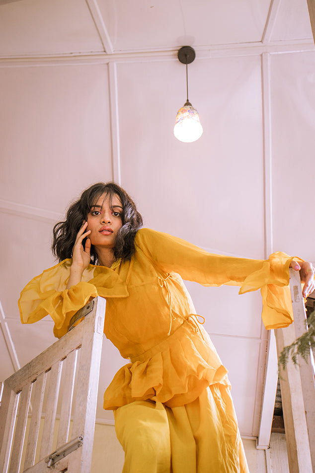 An organza silk full sleeve top in angrakha syle. The top is flared at the waist and at the cuffs. It is naturally dyed with marigold petals and turmeric dye.