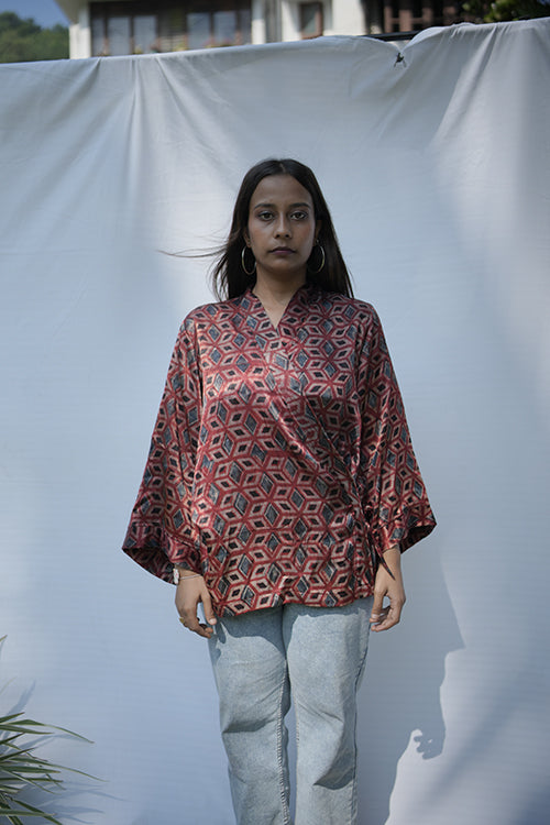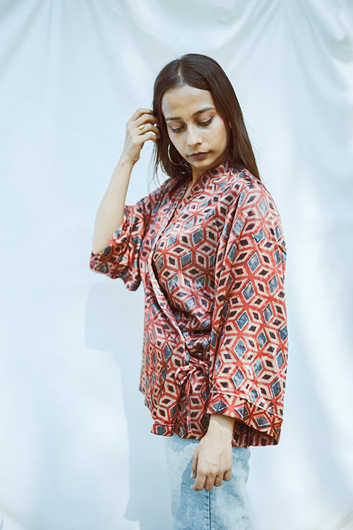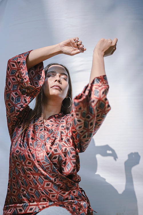 Rubia Angrakha top is handcrafted in buttery soft modal, hand block printed with natural dyes. A tie up overlapped front makes it a perfect fit for any size.